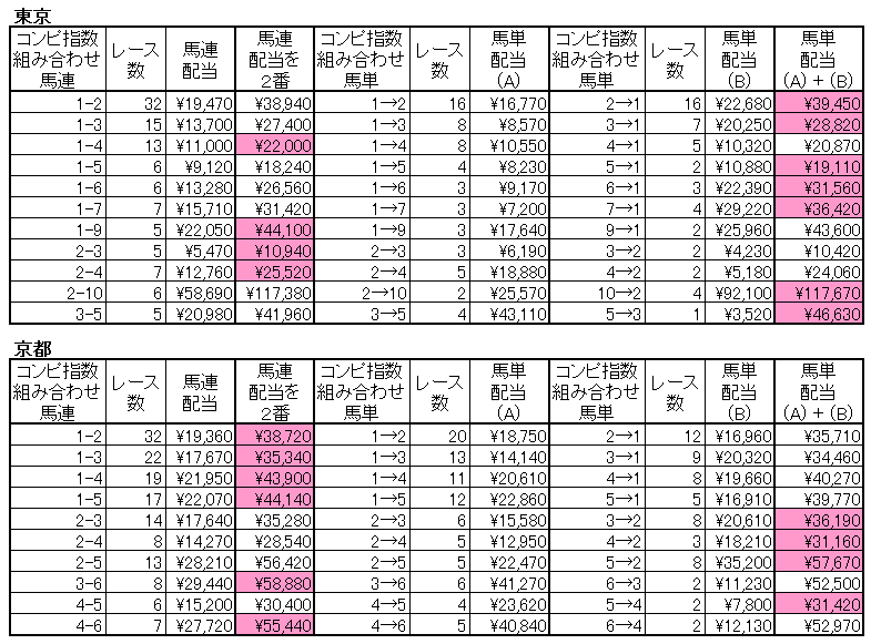 この表は東京と京都の今年最も的中レースが多い上位10位までで調べたものです。