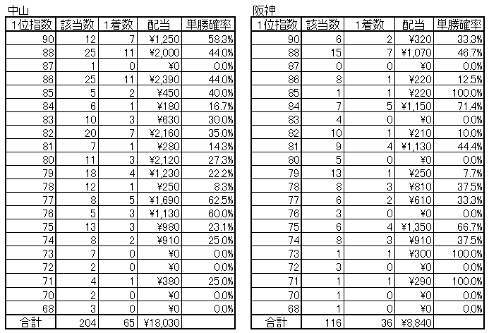 本日は今年の中山と阪神のコンピ指数1位が信頼出来るかを表にしてみました。見れば分かると思いますが表の左から1位指数番号、該当した数、1着になった数、その時の単勝配当、1着になる確率を表しました。