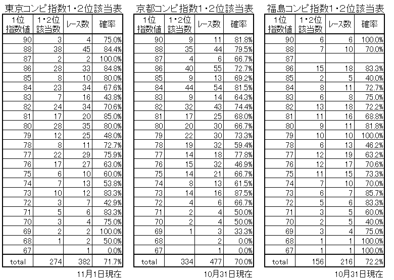 私の説明が不十分でもご覧いただけば解ると思います。ただし、頭数は考慮しないです。9頭以上のレースをデータといたしました。指数1・2位が1・2着になっても重複して計算はしていません。