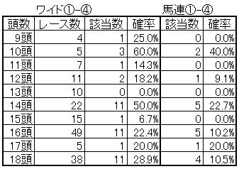 英国式紅茶教室 Blue Lady 紅茶 ケイキ 軸馬ください ↑ 上記のタグは話題の単語とお友達のHPとブログなどです。決してそれをクリックし誘導するものではありません。宜しく応援お願いします。 拍手ボタン&の応援お願いします。 また、への応援もお願いします。 こんにちは。コンピでGooの管理人ukato_conpiです。 先日の小倉での成功談を書き込みましたが、全レースでは一寸怖いという方に頭数別ではどうなっているか調べたのでお知らせします。ワイドを推奨しますが馬連でもそこそこいけるので合わせて馬連も表にして見ました。参考にしてください。基本は全レースです。知識が豊かになるとどうしても絞りたくなりますね。そのための表です。それではご覧くださり次の土日に活かして下さい。 この表を参考に成功した場合はコメントいただきたいですね。 あくまでもコンピ指数の1番目と4番目の組み合わせです。 因みに3連複で最も多い組み合わせも紹介してみます。 それは、①-④-⑥番目の組み合わせです。 頭数別では、16頭立てが4レース、そのほか10・12・14・18頭立てが1レースずつでした。 こんな風にお知らせすると途端にこなくなるのが心配です。 そうなっても嘘つきと後ろ指差さないでくださいね。 宜しく。