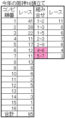 英国式紅茶教室 Blue Lady 紅茶 ケイキ 軸馬ください ↑ 上記のタグは話題の単語とお友達のHPとブログなどです。決してそれをクリックし誘導するものではありません。宜しく応援お願いします。 拍手ボタン&の応援お願いします。 また、への応援もお願いします。 こんにちは。 コンピでGooのukato_conpiです。 本日のお知らせの前に前記事をご覧くださいましたか。紅茶を飲みたくなりませんか。紅茶を飲めば競馬の的中が近づいて毎週プラスに転じるかもしれません。なぜそう言えるかは飲めば解ります。心が落ち着き冷静に馬番号を選べるからです。ぜひ、本物の紅茶をお召し上がり競馬で勝利してください。 それでは本日の本題です。いつも何をお知らせしたら皆様に喜んでいただけるか頭を悩まします。本日は今年阪神で開催された16頭立ての馬連での出目表を作りました。勿論コンピ指数の何番目が多いかです。コンピ指数は優れたデータを出しています。ですから1番目が絡むのは当然と思われますね。ところが16頭立てでは2番目が健闘しているのです。表をご覧頂けばお分かりです。いつもの表ですから説明は要らないと思います。最後の合計はレース数がわかるように2で割っています。また、右の枠は上位6レース以上絡んだ組み合わせです。また、色が付いているのは6レースに満たないですが美味しい組み合わせですから参考に載せました。ご覧頂く時は表をクリックして別ページでご覧ください。