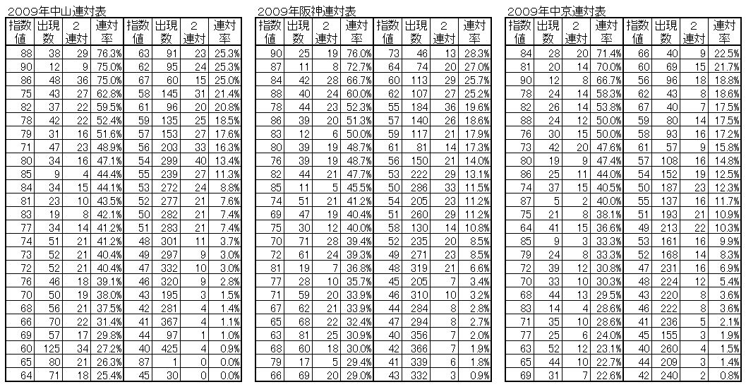 表の見方は左からコンピ指数値、出現数、2連対数、連対率の2列になっています。