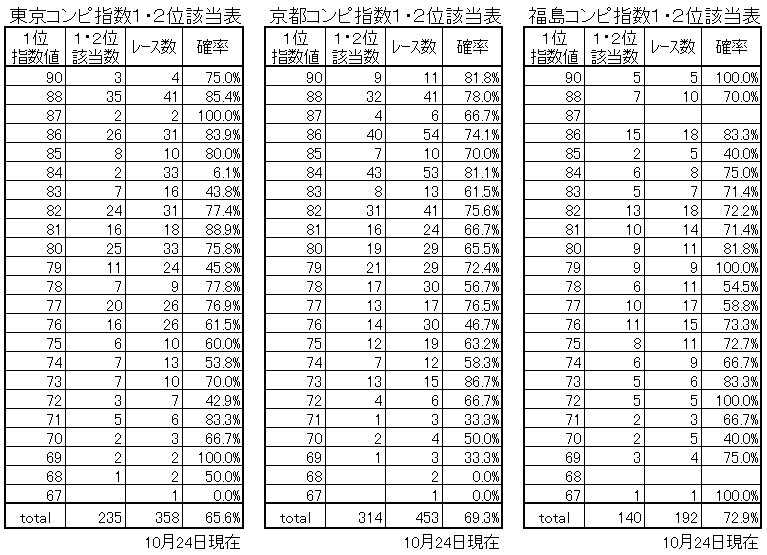 私の説明が不十分でもご覧いただけば解ると思います。ただし、頭数は考慮しないです。9頭以上のレースをデータといたしました。指数1・2位が1・2着になっても重複して計算はしていません。