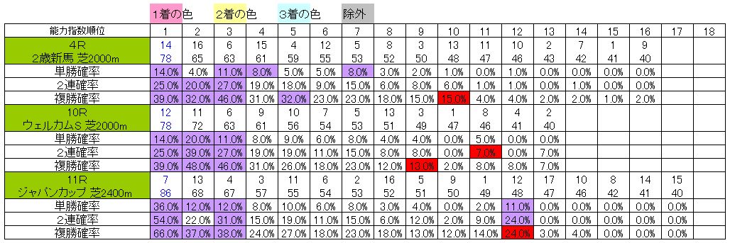 各確率上位3頭には紫の色をつけています。また、穴になるなら下位に付けた赤色が気になりますね。