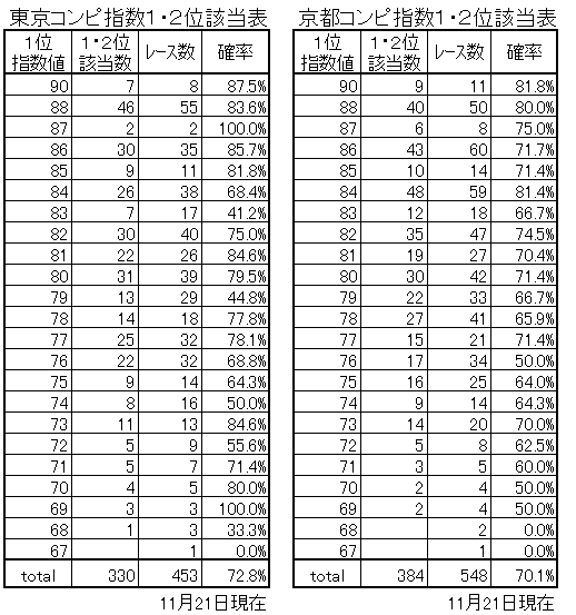 私の説明が不十分でもご覧いただけば解ると思います。ただし、頭数は考慮しないです。9頭以上のレースをデータといたしました。指数1・2位が1・2着になっても重複して計算はしていません。