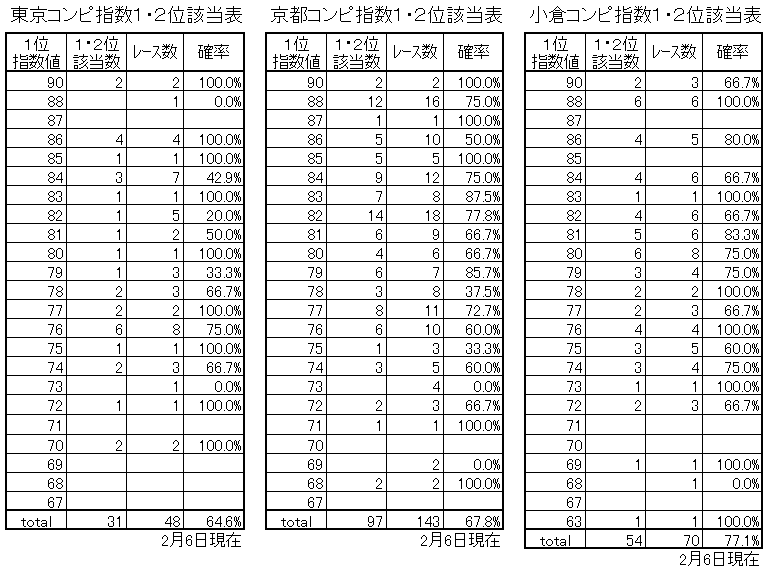 英国式紅茶教室 Blue Lady 軸馬ください ケイキ 上記のタグは話題の単語とお友達のHPとブログなどです。決してそれをクリックし誘導するものではありません。宜しく応援お願いします。 これからも下左の拍手ボタンとの応援お願いします。 また、への応援もお願いします。このお願いは競馬をされている方に告ぐものです。この応援があればこそ励みになるものです。どうぞよろしくお願いします。近頃皆様の応援を受け上位にランクされるようになって来ました。嬉しいです。 こんにちは。コンピでGooの管理人ukato_conpiです。 お馴染みになりました下の表、今週も今年のコンピ指数1位の指数値の時に1・2位の馬連該当はどのようになっているかをお伝えします。 データ数は少ないですがこの表を基に確実に馬券を仕留めましょう。 下の表は日刊コンピ指数の1位の数値のとき1位か2位が馬連に絡む確率を見ていただくためのものです。表の見方は左から1位の指数値、1位か2位の該当した数、1位の数値のレース数、確率の順となっています。 私の説明が不十分でもご覧いただけば解ると思います。ただし、頭数は考慮しないです。9頭以上のレースをデータといたしました。指数1・2位が1・2着になっても重複して計算はしていません。 この表をご覧いただくと日刊コンピ指数で競馬をしている方は軸馬が分かりますね。そして大儲けも簡単です。 再三お願いしている拍手がいただけません。沢山訪問いただいても皆さんの訪問を拒否せざるを得ません。 一度訪問して拍手をなさらなくても猶予をしています。2度目に訪問され拍手されない方は3度目には訪問制限をさせていただいています。 心苦しいですが止むを得ない措置です。何とか拍手を頂き再度の訪問をお願いいたします。 私のデータがあてにならないから再度訪問しない、と言うことで拍手されない方もいるのでしょうかね。それはそれで良いです。 毎回拍手を頂いている方に感謝します。本当にありがとうございます。 また、右のパスワードをお書き留めていますか。→パスワードはhohohoです。 このパスワードは金曜日と土曜日に使用します。夜の8時頃から次の朝までです。