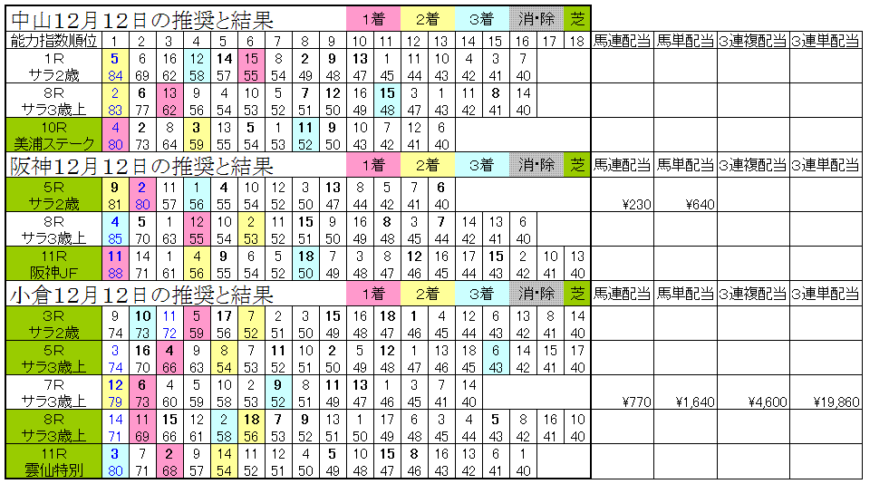 英国式紅茶教室 Blue Lady 軸馬ください ケイキ 上記のタグは話題の単語とお友達のHPとブログなどです。決してそれをクリックし誘導するものではありません。宜しく応援お願いします。 これからも下左の拍手ボタンとの応援お願いします。 また、への応援もお願いします。このお願いは競馬をされている方に告ぐものです。この応援があればこそ励みになります。どうぞよろしくお願いします。近頃皆様の応援を受け上位にランクされるようになって来ました。嬉しいです。 今週の私の推奨馬結果報告をします。 今週は先週の日曜日が不覚になり土曜日をお休みしました。満を持して望んだ日曜日は見事にパーフェクトとなり嬉しい気分に慕っています。この様になるためにデータを蓄積しているのですからね。 それでは、12日分の結果報告です。 推奨した馬番号に太字で記しています。既にお気付きでょうが微かに青い文字が映し出されていると思います。これは日刊コンピが推奨した馬番号です。 着順は色を見ていだければ分かると思います。 それでは早速日毎に見て行きます。 11日は、お休みしました。 12日は、阪神5R、小倉7Rの的中推奨がありました。配当は低いですが阪神は3頭3着まで入り3連単までいただき嬉しかったですね。不覚を出さないことを目標にしていますのでこれからも連日パーフェクトを出したいです。 この様な成績ですがご訪問並びに応援拍手をお願いします。 金曜日にExcelファイル(秘密の)を掲載予定です。500円がタダです。 今後ともこのブログ、別ブログ軸馬くださいをよろしくお願いします。 なお、今後のためにお書き込みください。→パスワードはhohohoです。 金曜日と土曜日の夜から朝までパスワードがないと入れません。 これは皆さんに喜んでもらうことが出来るであろうあの指数がExcelファイル(秘密の)になっています。 いつものことですが拍手の無い方は残念ながら訪問を制限しています。信頼ある方の訪問を望むからです。