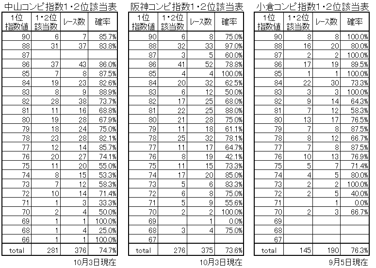 英国式紅茶教室 Blue Lady 軸馬ください ケイキ 上記のタグは話題の単語とお友達のHPとブログなどです。決してそれをクリックし誘導するものではありません。宜しく応援お願いします。 これからも下左の拍手ボタンとの応援お願いします。 また、への応援もお願いします。このお願いは競馬をされている方に告ぐものです。この応援があればこそ励みになるものです。どうぞよろしくお願いします。近頃皆様の応援を受け上位にランクされるようになって来ました。嬉しいです。 こんにちは。コンピでGooの管理人ukato_conpiです。 お馴染みになりつつある下の表、今週も今年のコンピ指数1位の指数値の時に1・2位の馬連該当はどのようになっているかをお伝えします。 下の表は日刊コンピ指数の1位の数値のとき1位か2位が馬連に絡む確率を見ていただくためのものです。表の見方は左から1位の指数値、1位か2位の該当した数、1位の数値のレース数、確率の順となっています。 私の説明が不十分でもご覧いただけば解ると思います。ただし、頭数は考慮しないです。9頭以上のレースをデータといたしました。指数1・2位が1・2着になっても重複して計算はしていません。 この表をご覧いただくと日刊コンピ指数で競馬をしている方は軸馬が分かりますね。そして大儲けも簡単です。 再三お願いしている拍手がいただけません。沢山訪問いただいても皆さんの訪問を拒否せざるを得ません。 一度訪問して拍手をなさらなくても猶予をしています。2度目に訪問され拍手されない方は3度目には訪問制限をさせていただいています。 心苦しいですが止むを得ない措置です。何とか拍手を頂き再度の訪問をお願いいたします。 私のデータがあてにならないから再度訪問しない、と言うことで拍手されない方もいるのでしょうかね。それはそれで良いです。 毎回拍手を頂いている方に感謝します。本当にありがとうございます。 また、右のパスワードをお書き留めていますか。→パスワードはhohohoです。 このパスワードは金曜日と土曜日に使用します。夜の8時頃から次の朝までです。