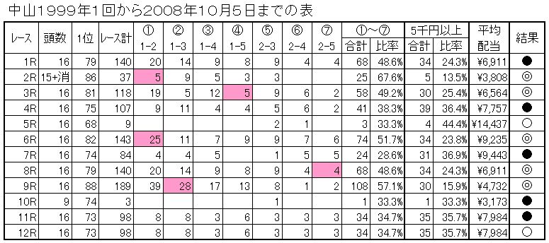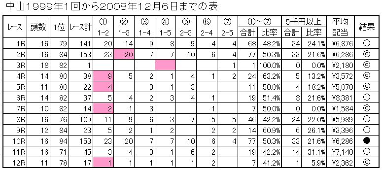 上記のタグは話題の単語とお友達のHPとブログなどです。決してそれをクリックし誘導するものではありません。宜しく応援お願いします。 こんばんは。コンピでGooの管理人ukato conpiです。 6・7日のくだらないデータ結果を報告いたします。 表の見方は、◎が①~⑦を○は5千円以上、●はそれ以外をあらわします。 また、表の中のピンク色は◎の結果に解りやすくするため色を付けました。 初日は、◎が5レース、○が2レース、●が5レースとデータとは裏腹に難しい競馬になりましたね。2日目は◎が6レース、○が5レース、●が1レースで堅い、荒れのはっきりしたレースが多かったですね。 下記の結果データで次回の競馬にお役立てください。次回も懲りずにデータを掲載します。 これからも拍手ボタン&ランキングの応援お願いします。
