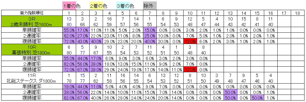 各確率上位3頭には紫の色をつけています。また、穴になるなら下位に付けた赤色が気になりますね。