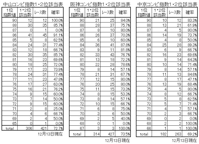 ![]() これからも拍手ボタン& また、 ![]() こんにちは。コンピでGooの管理人ukato_conpiです。 お馴染みになりつつある下の表、今週も今年のコンピ指数1位の指数値の時に1・2位の馬連該当はどのように なっ ているかをお伝えします。意外と1位指数だけを見ても1位か2位で軸馬が見つけられます。先週はこれを軸馬に当てはめれば70レース中55レースで1着か 2着になっていました。この確率は79%になります。 今週も3場となります。日刊コンピ指数を信じ1・2番目で 勝負いたしましょう。その為の表です。 別ブログの軸馬くださいに私の軸馬として明日に掲載します。また、これから軸馬くださいにはコンピ指数1番目に入った馬番の1・2着になった表を掲載します。どうぞお立ち寄りください。 これからの表は日刊コンピ指数の1位の数値のとき1位か2位が馬連に絡む確率を見ていただくためのものです。表の見方は左から1位の指数値、1位か2位の該当した数、1位の数値のレース数、確率の順となっています。 私の説明が不十分でもご覧いただけば解ると思います。ただし、頭数は考慮しないです。9頭以上のレースをデータといたしました。指数1・2位が1・2着になっても重複して計算はしていません。 PR