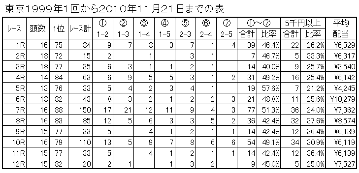 今週は東京と京都の2会場だけです。馬券もゆっくり検討できるのじゃないでしょうか。東京のくだらないデータを下に掲載しましたので参考にしていただければ幸いです。必ずしもデータ通りには行きませんがデータ数が多くなるとはまりますよ。