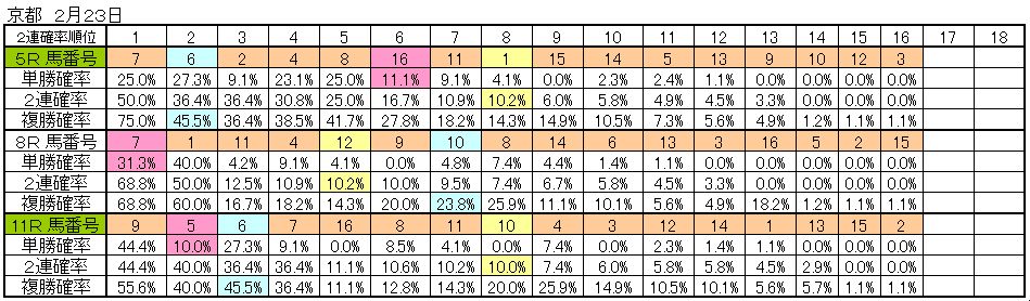 Blue Lady 紅茶教室 軸馬ください おーいおい 上記のタグは話題の単語とお友達のHPとブログなどです。決してそれをクリックし誘導するものではありません。宜しく応援お願いします。 これからも下左の拍手ボタンとの応援お願いします。 このお願いは競馬をされている方に告ぐものです。この応援があればこそ励みになるものです。どうぞよろしくお願いします。 まず初めに昨晩のダウンロードファイルは削除しました。 全国日刊コンピ指数ファンの皆様、おはようございます。 今週は東京だけの代替競馬です。 平日となりますから前日投票を済ませお仕事に向かったでしょうか。 前日投票しているのであれば私の下手くそ推奨を見ずに投票ですからお仕事から帰りましたらご確認して笑ったやってください。自分より本当に下手くそを恥ずかしくなく紹介しているねとね。 近頃巷でこのデータは使えるねという声が高まっています。 このデータというのは私が販売しているものです。どうぞお買い求めください。金・土曜日は65円の有料、土・日曜日はタダの無料となっています。その無料は昨日の結果を【2月23日 京都2連確率データ結果】としていますのでお買い求めください。 推奨結果報告します。1着、2着、3着は太で表します。また途中取り消しや除外された場合は斜体にしています。 東京 04R 04・08・06・14 05R 08・04・07・09 08R 11・08・07・12←不覚 09R 02・08・09・12←不覚 10R 13・02・05・07←不覚 11R 05・06・12・04 以上。いずれもコンピ指数順に並べました。 下は、昨日の京都の的中確率結果です。 なお、訪問されても拍手を頂かない方は今まで通り訪問の制限をいたします。 あしからず。