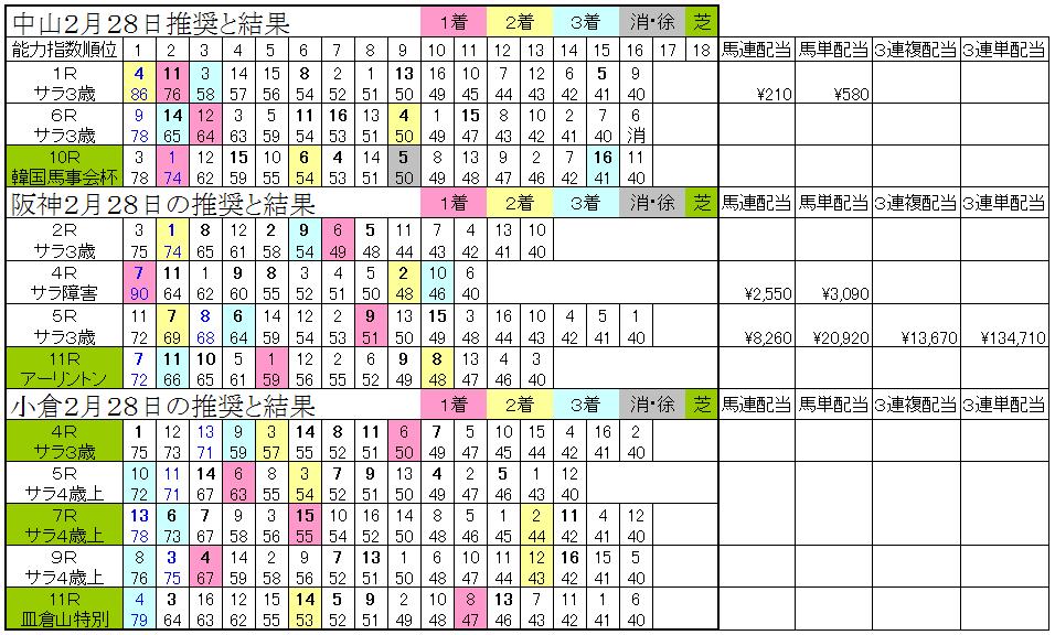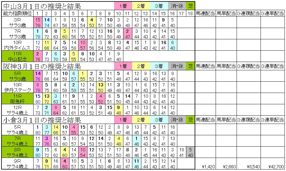 英国式紅茶教室 Blue Lady 紅茶 ケイキ 軸馬ください ゆふいん華 ↑ 上記のタグは話題の単語とお友達のHPとブログなどです。決してそれをクリックし誘導するものではありません。宜しく応援お願いします。 こんばんは。コンピでGooの管理人ukato conpiです。 今週の私の推奨馬結果報告をします。 その前に【NEW】競馬ランキング&競馬情報検索エンジン 競馬サーチ.com のお知らせです。このサイトは皆さんご存知でしょうね。ランキングサイトですがそれだけじゃないのです。情報・データが提供されるデスクトップツールが無料で使えるのです。私のデータと比べていただければ良いですね。どちらが勝るかです。勿論私も負けません。それでは、いつもの結果報告です。 今週の皆さんの競馬はいかがでしたか。私の的中推奨は4レースでした。不覚レース4レース出しました。先週と同じ様な結果でした。不思議ですね。今週も10万馬券を推奨できていました。嬉しいことですね。 また、別ブログ軸馬くださいでは皆様からの軸馬を募集しています。一度お立ち寄りくださいまして、次回の競馬に軸馬をいただきたいですね。今週の軸馬がもし当たれば55%で的中できましたね。 推奨した馬番号に太字で記しています。既にお気付きでしょうが微かに青い文字が映し出されていると思います。これは日刊コンピが推奨した馬番号です。 着順は色を見ていだければ分かると思います。 それでは早速日毎に見て行きます。 2月28日は、中山1R、阪神4R、5Rの的中推奨が出来、残念ながら小倉で2レースの不覚を出しました。この日も先週に引き続き10万馬券を提供でき不覚を帳消ししたのではないかと言い訳をします。開催代わりで馬場状態がよく見ていて楽しめたのではないでしょうか。 3月1日は小倉9Rで的中推奨が出来ました。これが唯一の的中推奨でした。また、中山と小倉で不覚を出しました。3着までに2頭は推奨できていますが組み合わせが悪く馬連の的中には至りませんでした。 今後とも、この様な結果ですがこのブログ、別ブログ軸馬くださいをよろしくお願いします。 これからも拍手ボタン&ランキングの応援お願いします。 また、ブログランキングセンターへの応援もお願いします。