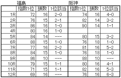 昨日同様福島・阪神くだらないデータを掲載します。余り参考にならないと思いますが気休めでご覧ください。注意として阪神4Rは8頭立てのためデータがありませんことをお伝えしておきます。それから阪神1Rは楽しい結果が待っているような気がします。1番目の馬は4度とも3着になっています。