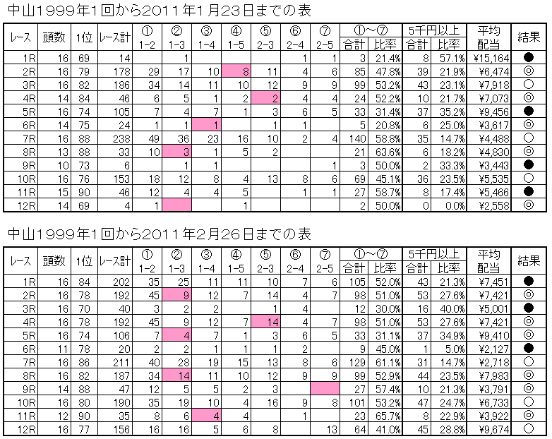 Blue Lady 紅茶教室 軸馬ください ケイキ また、 ![]() ![]() こんにちは。コンピでGooの管理人ukato_conpiです。 今週の中山くだらないデータのご報告です。皆さんの成績はいかがでしたか。私はお陰さまで馬券道場の昇段にあと780円となりました。2日で残り僅かですからクリアできるかと思いますが油断できない残り6日です。と自慢している場合じゃありません。結果報告です。 表の見方は、◎が①~⑦を○は5千円以上、●はそれ以外をあらわします。 また、表の中のピンク色は◎の結果を解りやすくするため色を付けました。 26日の結果は、◎が5レース、○が3レース、●が4レースでした。 東京から中山に変わっても難しい競馬が続いています。データはあてになりませんね。と言う声も聞こえてくるような気がします。それでも一日を通してどんなレースの日になるか予測ができるようでもありますから上手にお使いください。 27日の結果は、◎が6レース、○が3レース、●が3レースでした。 この日は今年の順当な結果となりました。前日と◎と●が一つ増減しただけですが万馬券が増えたので喜んだ方も多かったのじゃありませんか。コンピ指数で言えば14番目が絡みましたね。しかも42でした。16頭レースでは後ろから3番目の42ですね。 下記の結果データで次回の競馬にお役立てください。次回もデータを掲載します。 下の拍手をお願いします。拍手のない方はやむなく訪問を制限いたしております。私が意地悪している訳ではありません。皆さんの信頼性を尋ねているからです。 一つの非クリックが100万馬券を逃すのでしょう。また、土・日には500円を捨てなくても済むのですがね。あのファイルが◯◯です。 また、パスワードを書き込んでいますがこのパスワードをお控え願います。金・土の20時頃から使うようになります。よろしくお願いします。 →パスワードはhohohoです。 PR