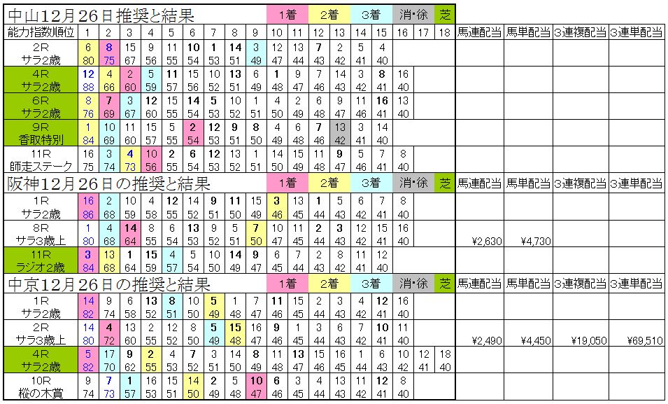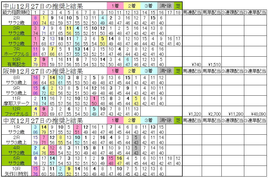 上記のタグは話題の単語とお友達のHPとブログなどです。決してそれをクリックし誘導するものではありません。宜しく応援お願いします。これからも下左の拍手ボタンと右バナー拍手& また、 への応援もお願いします。このお願いはご訪問された方に告ぐものです。この応援があればこそ励みになります。どうぞよろしくお願いします。近頃皆様の応援を受け上位にランクされるようになって来ました。嬉しいです。こんにちは。コンピでGooの管理人ukato_conpiです。 今週の私の推奨馬結果報告をします。 今年最後の競馬も2日とも1レースずつの不覚を出し大変申し訳ありませんでした。的中推奨は4レースでした。50万円以上の推奨を夢見て挑戦しましたが不発に終わりました。本当に申し訳ありませんでした。しかし不覚を出しても50万馬券以上を狙ってこの成績ですから仕方ないのかと思っています。 ここ2・3日拍手のお願いをし訪問の制限したためかまたは年末の忙しさからか訪問が少ない一日となっています。今年いっぱい拍手を頂かない方は訪問の制限をいたします。制限をされないよう拍手をお願いいたします。 それでは日を追って見てください。 推奨した馬番号に太字で記しています。既にお気付きでょうが微かに青い文字が映し出されていると思います。これは日刊コンピが推奨した馬番号です。 着順は色を見ていだければ分かると思います。 それでは早速日毎に見て行きます。 次週は次週の前に金杯があります。これで乾杯できるような推奨をしたいと思います。 この様な結果ですがこのブログ、別ブログ軸馬くださいをよろしくお願いします。 PR