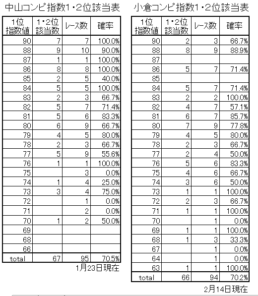 私の説明が不十分でもご覧いただけば解ると思います。ただし、頭数は考慮しないです。9頭以上のレースをデータといたしました。指数1・2位が1・2着になっても重複して計算はしていません。