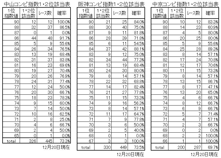 上記のタグは話題の単語とお友達のHPとブログなどです。決してそれをクリックし誘導するものではありません。宜しく応援お願いします。これからも下左の拍手ボタンと右バナー拍手& また、 への応援もお願いします。こんにちは。コンピでGooの管理人ukato_conpiです。 まず初めに拍手をお願いしています。そうしましたら本日一人の方から拍手をいただきました。ありがとうございます。ずっと監視をしていましたが私が留守をした間に6人の方に訪問していただきました。その中の一人の方の拍手だと思います。特定できませんので今後監視を続け解り次第他の方の訪問を制限します。 この記事にも拍手をお願いします。今後の参考になるための拍手のお願いだと思ってくださいね。 それではお馴染みになりつつある下の表、今週も今年のコンピ指数1位の指数値の時に1・2位の馬連該当はどのように なっ ているかをお伝えします。意外と1位指数だけを見ても1位か2位で軸馬が見つけられます。先週はこれを軸馬に当てはめれば70レース中54レースで1着か2着になっていました。この確率は77%になります。凄いですよね。 日刊コンピ指数を信じ1・2番目で 勝負いたしましょう。その為の表です。 別ブログの軸馬くださいに私の軸馬として明日に掲載します。また、これから軸馬くださいにはコンピ指数1番目に入った馬番の1・2着になった表を掲載します。どうぞお立ち寄りください。 これからの表は日刊コンピ指数の1位の数値のとき1位か2位が馬連に絡む確率を見ていただくためのものです。表の見方は左から1位の指数値、1位か2位の該当した数、1位の数値のレース数、確率の順となっています。 私の説明が不十分でもご覧いただけば解ると思います。ただし、頭数は考慮しないです。9頭以上のレースをデータといたしました。指数1・2位が1・2着になっても重複して計算はしていません。 PR
