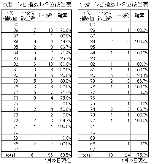 私の説明が不十分でもご覧いただけば解ると思います。ただし、頭数は考慮しないです。9頭以上のレースをデータといたしました。指数1・2位が1・2着になっても重複して計算はしていません。