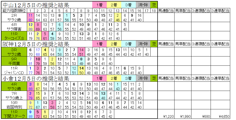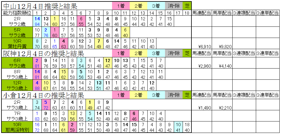 英国式紅茶教室 Blue Lady 軸馬ください ケイキ 上記のタグは話題の単語とお友達のHPとブログなどです。決してそれをクリックし誘導するものではありません。宜しく応援お願いします。 これからも下左の拍手ボタンとの応援お願いします。 また、への応援もお願いします。このお願いは競馬をされている方に告ぐものです。この応援があればこそ励みになります。どうぞよろしくお願いします。近頃皆様の応援を受け上位にランクされるようになって来ました。嬉しいです。 今週の私の推奨馬結果報告をします。 今週は久々に2日間推奨できたことは喜ばしく思いました。しかし、2日目に不覚を2レース出したため次週は初日を休ませていただきます。2日目は推奨するつもりでいます。それでは今週の結果報告。 推奨した馬番号に太字で記しています。既にお気付きでょうが微かに青い文字が映し出されていると思います。これは日刊コンピが推奨した馬番号です。 着順は色を見ていだければ分かると思います。 それでは早速日毎に見て行きます。 4日は、中山10R、阪神6R、小倉2Rで的中推奨が出来ました。小倉7Rの3連単100万馬券の1着になったことは自慢できました。他の2頭も入れば尚良かったのですが次のお預けと致します。 5日は、小倉11Rの的中推奨がありましたが中山と小倉で1レースずつの不覚を出し2日間のパーフェクトを逃したことが悔しかったです。次週は初日を休ませてもらいます。 この様な成績ですがご訪問並びに応援拍手をお願いします。 金曜日にExcelファイル(秘密の)を掲載予定です。500円がタダです。 今後ともこのブログ、別ブログ軸馬くださいをよろしくお願いします。 なお、今後のためにお書き込みください。→パスワードはhohohoです。 金曜日と土曜日の夜から朝までパスワードがないと入れません。 これは皆さんに喜んでもらうことが出来るであろうあの指数がExcelファイル(秘密の)になっています。 いつものことですが拍手の無い方は残念ながら訪問を制限しています。信頼ある方の訪問を望むからです。