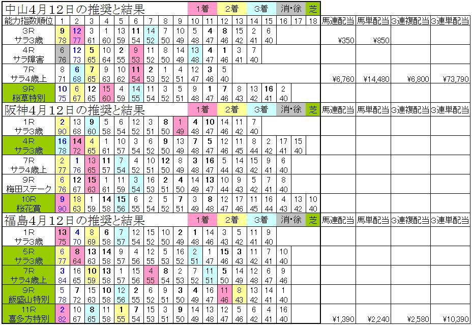 英国式紅茶教室 Blue Lady 紅茶 ケイキ 軸馬ください ゆふいん華 ↑ 上記のタグは話題の単語とお友達のHPとブログなどです。決してそれをクリックし誘導するものではありません。宜しく応援お願いします。 こんばんは。コンピでGooの管理人ukato_conpiです。 今週の私の推奨馬結果報告をします。 今週の皆さんの競馬はいかがでしたか。私の的中推奨は5レースと不覚レース5レース出しました。福島が今年初めて開催されデータがないので昨年のデータを用いましたが結果は上手く行きませんでした。先週までの1日だけのパーフェクトも出来ず残念でした。申し訳ありません。 別ブログ軸馬くださいで は皆様からの軸馬を募集しています。一度お立ち寄りくださいまして、次回の競馬に軸馬をいただきたいですね。今週の軸馬がもし当たれば56%で的中できま したね。その中には万馬券がありました。 推奨した馬番号に太字で記しています。既にお気付きでしょうが微かに青い文字が映し出されていると思います。これは日刊コンピが推奨した馬番号です。 着順は色を見ていだければ分かると思います。 それでは早速日毎に見て行きます。 11日は阪神4・5Rで的中推奨が出来ましたね。3連単が的中したため5万5千強の配当となりました。不覚レースは福島の5・6Rで出しました。昨年のデータでは上手く行きませんね。 12日は中山3・7R、福島11Rで的中推奨が出来ました。中山の7Rと福島の11Rは3着まで入り3連単高配当となりました。しかし、各馬場とも1レースずつ不覚を出しました。 今後とも、この様な結果ですがこのブログ、別ブログ軸馬くださいをよろしくお願いします。 これからも拍手ボタン&ランキングの応援お願いします。 また、ブログランキングセンターへの応援もお願いします。