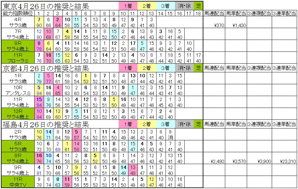 英国式紅茶教室 Blue Lady 紅茶 ケイキ 軸馬ください ゆふいん華 ↑ 上記のタグは話題の単語とお友達のHPとブログなどです。決してそれをクリックし誘導するものではありません。宜しく応援お願いします。 こんばんは。コンピでGooの管理人ukato_conpiです。 今週の私の推奨馬結果報告をします。 今週の皆さんの競馬はいかがでしたか。私の的中推奨は6レースと不覚レース4レース出しました。いつも言えることですが12Rに不覚を出す傾向にあります。どうしてでしょうかね。考えると眠れなくなります。早速報告をいたします。 別ブログ軸馬くださいで は皆様からの軸馬を募集しています。一度お立ち寄りくださいまして、次回の競馬に軸馬をいただきたいですね。今週の軸馬がもし当たれば56%で的中できま したね。その中には万馬券がありました。 推奨した馬番号に太字で記しています。既にお気付きでしょうが微かに青い文字が映し出されていると思います。これは日刊コンピが推奨した馬番号です。 着順は色を見ていだければ分かると思います。 それでは早速日毎に見て行きます。 25日は東京5・8R、福島11・12Rで的中推奨が出来ました。その中でも福島最終レースで3連単24万馬券を推奨できたことは嬉しいですね。しかし不覚レースを京都と東京で各1レースずつ出し悔しい思いです。 26日は東京4R、福島8Rで的中推奨が出来ました。しかしこの日も京都と福島で各1レースずつ不覚を出し申し訳ありませんでした。不覚を出すまいとする余り不覚が出るので言い訳のしようがありません。 今後とも、この様な結果ですがこのブログ、別ブログ軸馬くださいをよろしくお願いします。 これからも拍手ボタン&ランキングの応援お願いします。 また、ブログランキングセンターへの応援もお願いします。