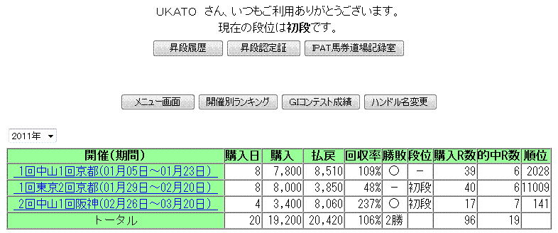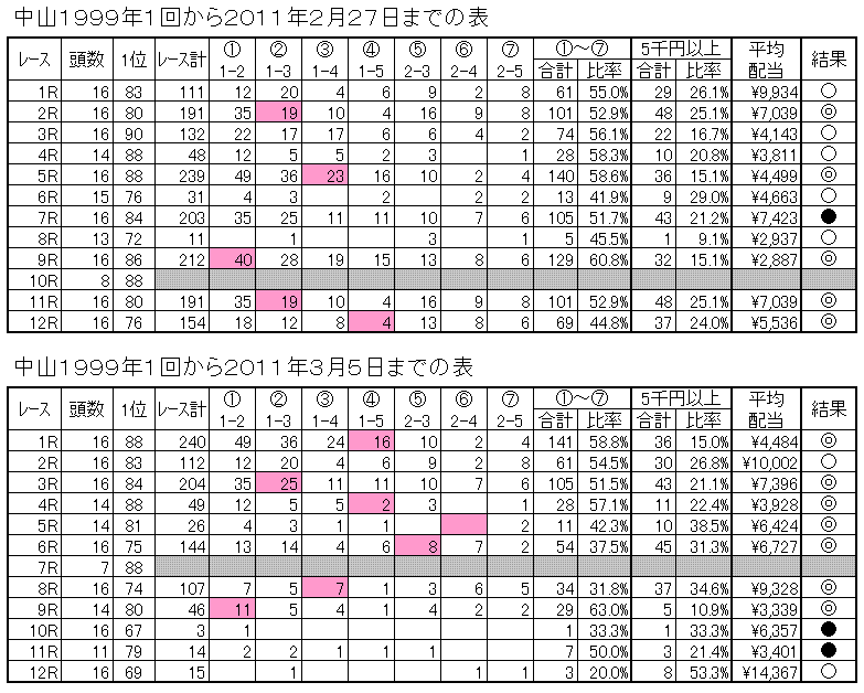 Blue Lady 紅茶教室 軸馬ください ケイキ また、 への応援もお願いします。このお願いはご訪問された方に告ぐものです。この応援があればこそ励みになります。どうぞよろしくお願いします。近頃皆様の応援を受け上位にランクされています。嬉しいです。こんにちは。コンピでGooの管理人ukato_conpiです。 今週の中山くだらないデータのご報告です。皆さんの成績はいかがでしたか。私はまたしても自慢です。お陰さまで競馬道場の2段に昇格しました。4日目での昇段は初めての快挙です。残り4日は見していいです。別に順位が1位になれる訳じゃありませんからね。下にその画像を掲載します。2勝は2段の証です。 それではくだらないデータの結果報告です。 表の見方は、◎が①~⑦を○は5千円以上、●はそれ以外をあらわします。 また、表の中のピンク色は◎の結果を解りやすくするため色を付けました。 5日の結果は、◎が5レース、○が5レース、●が1レースでした。 荒れた一日となりました。データ通りには行きませんが1Rは見事にはまりましたね。その他は目安となったくらいでデータがあっても難しかったでしょうね。 6日の結果は、◎が7レース、○が2レース、●が2レースでした。 この日はデータ通りになったと同時にJRAの思惑通りになりました。こんな時はやっぱりコンピ指数が頼りになれますね。 下記の結果データで次回の競馬にお役立てください。次回もデータを掲載します。 下の拍手をお願いします。拍手のない方はやむなく訪問を制限いたしております。私が意地悪している訳ではありません。皆さんの信頼性を尋ねているからです。 一つの非クリックが100万馬券を逃すのでしょう。また、土・日には500円を捨てなくても済むのですがね。あのファイルが◯◯です。 また、パスワードを書き込んでいますがこのパスワードをお控え願います。金・土の20時頃から使うようになります。よろしくお願いします。 →パスワードはhohohoです。 PR