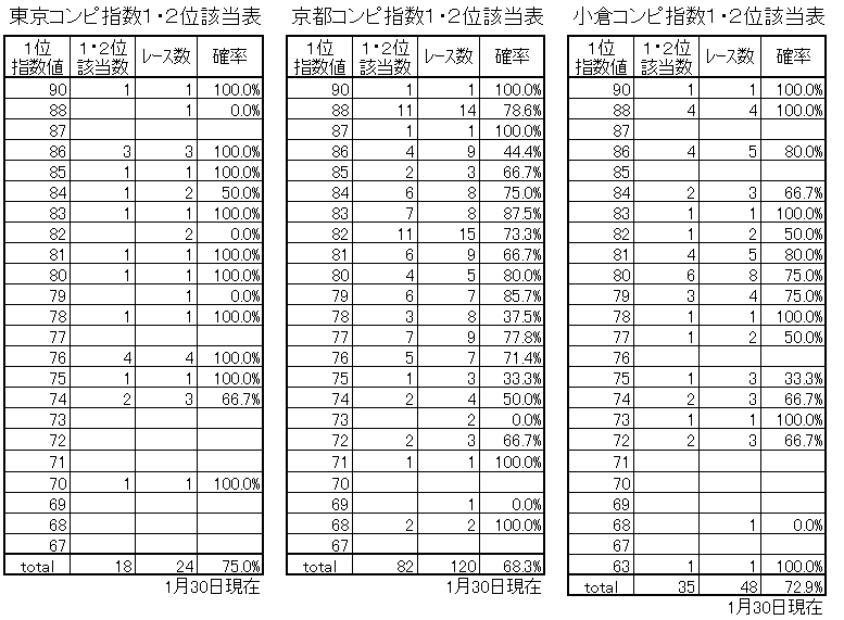 英国式紅茶教室 Blue Lady 軸馬ください ケイキ 上記のタグは話題の単語とお友達のHPとブログなどです。決してそれをクリックし誘導するものではありません。宜しく応援お願いします。 これからも下左の拍手ボタンとの応援お願いします。 また、への応援もお願いします。このお願いは競馬をされている方に告ぐものです。この応援があればこそ励みになるものです。どうぞよろしくお願いします。近頃皆様の応援を受け上位にランクされるようになって来ました。嬉しいです。 こんにちは。コンピでGooの管理人ukato_conpiです。 お馴染みになりました下の表、今週も今年のコンピ指数1位の指数値の時に1・2位の馬連該当はどのようになっているかをお伝えします。 データ数は少ないですがこの表を基に確実に馬券を仕留めましょう。 下の表は日刊コンピ指数の1位の数値のとき1位か2位が馬連に絡む確率を見ていただくためのものです。表の見方は左から1位の指数値、1位か2位の該当した数、1位の数値のレース数、確率の順となっています。 私の説明が不十分でもご覧いただけば解ると思います。ただし、頭数は考慮しないです。9頭以上のレースをデータといたしました。指数1・2位が1・2着になっても重複して計算はしていません。 この表をご覧いただくと日刊コンピ指数で競馬をしている方は軸馬が分かりますね。そして大儲けも簡単です。 再三お願いしている拍手がいただけません。沢山訪問いただいても皆さんの訪問を拒否せざるを得ません。 一度訪問して拍手をなさらなくても猶予をしています。2度目に訪問され拍手されない方は3度目には訪問制限をさせていただいています。 心苦しいですが止むを得ない措置です。何とか拍手を頂き再度の訪問をお願いいたします。 私のデータがあてにならないから再度訪問しない、と言うことで拍手されない方もいるのでしょうかね。それはそれで良いです。 毎回拍手を頂いている方に感謝します。本当にありがとうございます。 また、右のパスワードをお書き留めていますか。→パスワードはhohohoです。 このパスワードは金曜日と土曜日に使用します。夜の8時頃から次の朝までです。