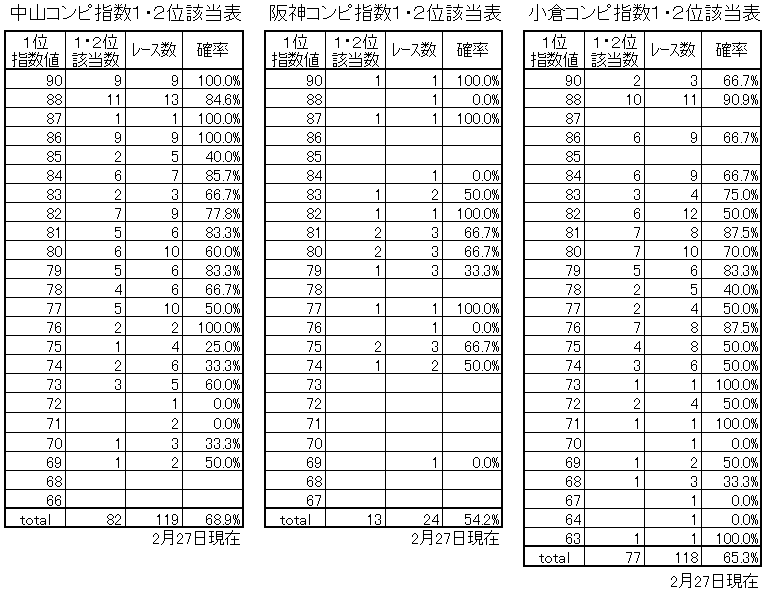 私の説明が不十分でもご覧いただけば解ると思います。ただし、頭数は考慮しないです。9頭以上のレースをデータといたしました。指数1・2位が1・2着になっても重複して計算はしていません。もし分からない方は遠慮なさらず尋ねてください。