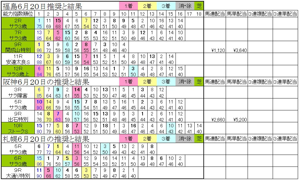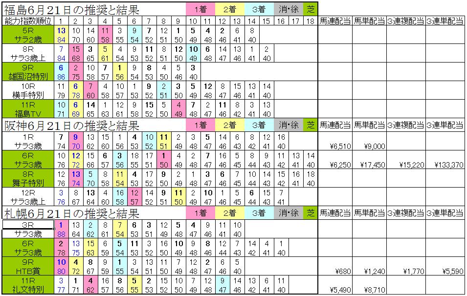 英国式紅茶教室 Blue Lady 紅茶 ケイキ 軸馬ください ↑ 上記のタグは話題の単語とお友達のHPとブログなどです。決してそれをクリックし誘導するものではありません。宜しく応援お願いします。 拍手ボタン&の応援お願いします。 また、への応援もお願いします。 こんばんは。コンピでGooの管理人ukato_conpiです。 今週の私の推奨馬結果報告をします。 今週の皆さんの競馬はいかがでしたか。 私はお蔭様で初めての2日間をパーフェクトを達成できました。最高の喜びです。また的中推奨は6レースでありました。パーフェクトで有頂天になっています。しかし、21日の6Rで記入ミスがあったので少し心苦しく思っています。コンピ指数をご覧になっている方は直ぐに気付かれたと思いますが私の推奨馬番号だけ見ている方には大変申し訳なく思っています。2週続けてのお詫びです。本当にごめんなさい。 推奨した馬番号に太字で記しています。既にお気付きでしょうが微かに青い文字が映し出されていると思います。これは日刊コンピが推奨した馬番号です。 着順は色を見ていだければ分かると思います。 それでは早速日毎に見て行きます。 20日は福島9R、阪神9Rで的中推奨が出来ました。いつもここに不覚を出しましたと書かずに済むので最高に気持ちよく書き込んでいます。的中報告できなくても不覚を出さない推奨が私のモットーですから最高の気分です。 21日は阪神1・6R、札幌9・11Rで的中しました。中でも2レースで3連単まで的中することが出来ましたね。この日のパーフェクトで初めて2日通してパーフェクトで大雨が心配される事態です。 本当に気持ちが良いですね。前述にも書きましたが阪神6Rの12番とすべき所を11番と記入したのが悔やまれます。 今後とも、充分気をつけますのでもし記入に間違いを気付かれた方はお知らせいただければ嬉しいですね。 この様な結果ですがこのブログ、別ブログ軸馬くださいをよろしくお願いします。