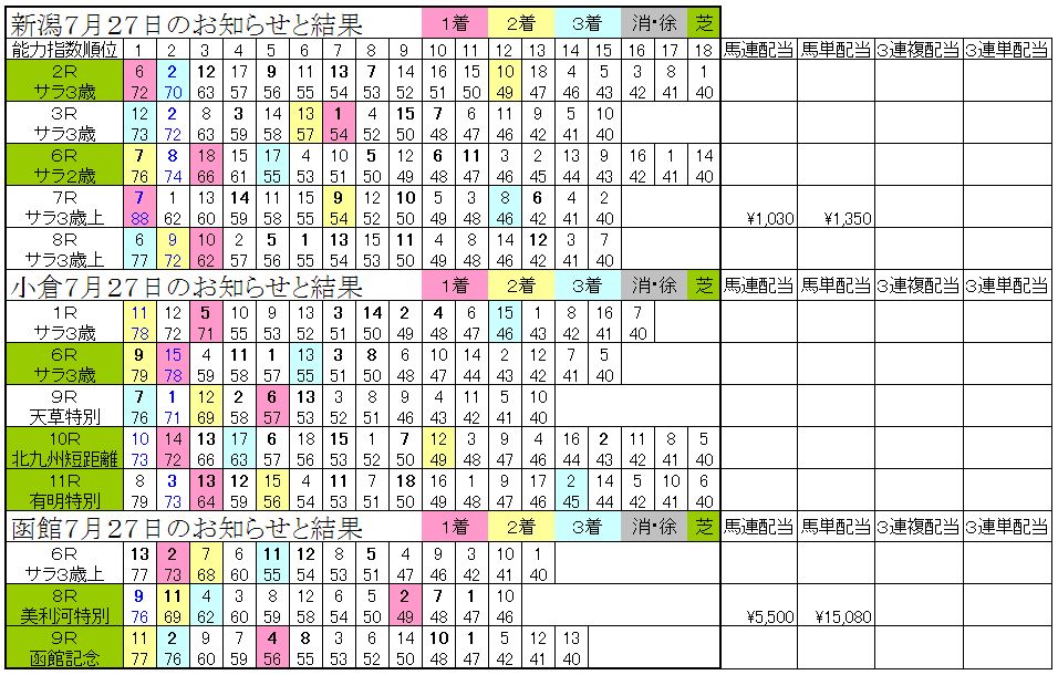 27日は、 新潟7Rと函館8Rで的中しました。残念ながら不覚レースを新潟8Rと小倉10Rで出し申し訳なく思っています。多くの1着馬を推奨できているのに、2着馬を推奨できていない悔しさだけが残る日曜日となりました。