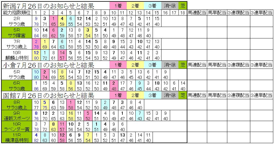 26日は、的中レースがなく不覚レースを新潟7Rと函館9Rで出しました。的中レースを出さないのは珍しい事ではありませんが、言い訳をすれば先週のお知らせの不備がおお引いていたのも事実です。推奨するときに慎重になりすぎ見落とした馬もありました。