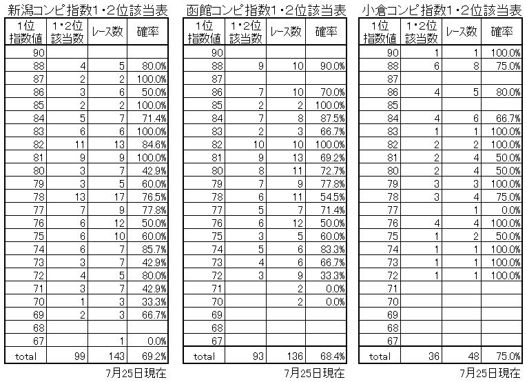 英国式紅茶教室 Blue Lady 軸馬ください ケイキ 上記のタグは話題の単語とお友達のHPとブログなどです。決してそれをクリックし誘導するものではありません。宜しく応援お願いします。 これからも下左の拍手ボタンとの応援お願いします。 また、への応援もお願いします。このお願いは競馬をされている方に告ぐものです。この応援があればこそ励みになるものです。どうぞよろしくお願いします。近頃皆様の応援を受け上位にランクされるようになって来ました。嬉しいです。 こんにちは。コンピでGooの管理人ukato_conpiです。 お馴染みになりつつある下の表、今週も今年のコンピ指数1位の指数値の時に1・2位の馬連該当はどのようになっているかをお伝えします。 これからの表は日刊コンピ指数の1位の数値のとき1位か2位が馬連に絡む確率を見ていただくためのものです。表の見方は左から1位の指数値、1位か2位の該当した数、1位の数値のレース数、確率の順となっています。 私の説明が不十分でもご覧いただけば解ると思います。ただし、頭数は考慮しないです。9頭以上のレースをデータといたしました。指数1・2位が1・2着になっても重複して計算はしていません。 この表をご覧いただくと日刊コンピ指数で競馬をしている方は軸馬が分かりますね。そして大儲けも簡単です。 再三お願いしている拍手がいただけません。沢山訪問いただいても皆さんの訪問を拒否せざるを得ません。 一度訪問して拍手をなさらなくても猶予をしています。2度目に訪問され拍手されない方は3度目には訪問制限を受けさせていただいています。 心苦しいですが止むを得ない措置です。何とか拍手を頂き再度の訪問をお願いいたします。 私のデータがあてにならないから再度訪問しない、と言うことで拍手されない方もいるのでしょうかね。それはそれで良いです。 毎回拍手を頂いている方に感謝します。本当にありがとうございます。 また、明日の20時頃から翌朝までパスワードがないとブログを閲覧することが出来ないことになります。なぜかは明日ご覧いただければ分かります。500円が・・・。 パスワードはhohohoです。 追伸:本日15時台に拍手をいただきました鳥取からお越しの方の訪問を許可いたしました。 以前お越しいただいた時(4月2日、5月31日、6月28日)には拍手をいただかなかったので制限していました。あしからず。今後は面倒でしょうが拍手をお願いいたします。