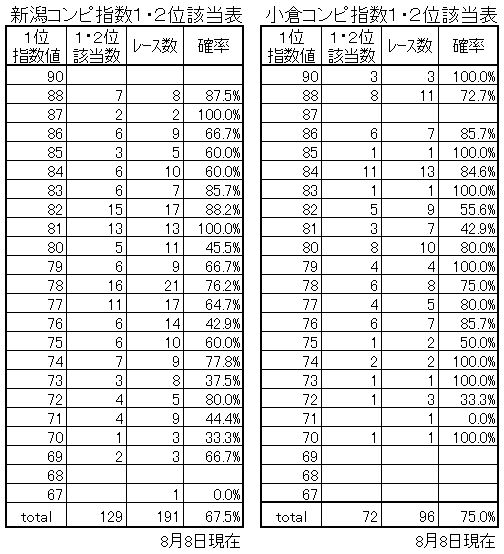 お馴染みになりつつある下の表、今週も今年のコンピ指数1位の指数値の時に1・2位の馬連該当はどのようになっているかをお伝えします。今週は開催替わりと札幌の初めての開催のため新潟と小倉だけになっています。
