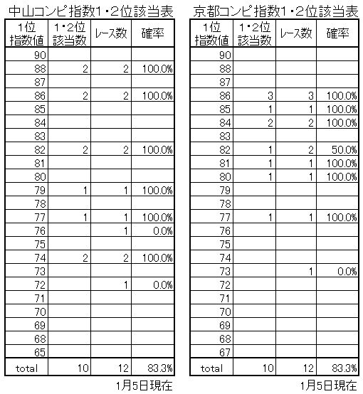 私の説明が不十分でもご覧いただけば解ると思います。ただし、頭数は考慮しないです。9頭以上のレースをデータといたしました。指数1・2位が1・2着になっても重複して計算はしていません。