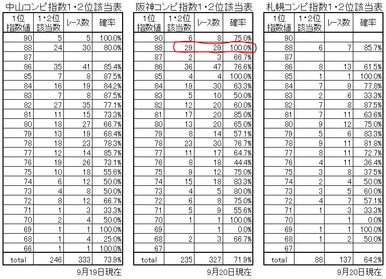 英国式紅茶教室 Blue Lady 軸馬ください ケイキ 上記のタグは話題の単語とお友達のHPとブログなどです。決してそれをクリックし誘導するものではありません。宜しく応援お願いします。 これからも下左の拍手ボタンとの応援お願いします。 また、への応援もお願いします。このお願いは競馬をされている方に告ぐものです。この応援があればこそ励みになるものです。どうぞよろしくお願いします。近頃皆様の応援を受け上位にランクされるようになって来ました。嬉しいです。 こんにちは。コンピでGooの管理人ukato_conpiです。 お馴染みになりつつある下の表、今週も今年のコンピ指数1位の指数値の時に1・2位の馬連該当はどのようになっているかをお伝えします。 この表の阪神88に赤で囲みを入れていますが先週同様88が出現したときは100%で勝利してください。変わっていません。 これからの表は日刊コンピ指数の1位の数値のとき1位か2位が馬連に絡む確率を見ていただくためのものです。表の見方は左から1位の指数値、1位か2位の該当した数、1位の数値のレース数、確率の順となっています。 私の説明が不十分でもご覧いただけば解ると思います。ただし、頭数は考慮しないです。9頭以上のレースをデータといたしました。指数1・2位が1・2着になっても重複して計算はしていません。 この表をご覧いただくと日刊コンピ指数で競馬をしている方は軸馬が分かりますね。そして大儲けも簡単です。 再三お願いしている拍手がいただけません。沢山訪問いただいても皆さんの訪問を拒否せざるを得ません。 一度訪問して拍手をなさらなくても猶予をしています。2度目に訪問され拍手されない方は3度目には訪問制限を受けさせていただいています。 心苦しいですが止むを得ない措置です。何とか拍手を頂き再度の訪問をお願いいたします。 私のデータがあてにならないから再度訪問しない、と言うことで拍手されない方もいるのでしょうかね。それはそれで良いです。 毎回拍手を頂いている方に感謝します。本当にありがとうございます。 また、明日の20時頃から翌朝までパスワードがないとブログを閲覧することが出来ないことになります。なぜかは明日ご覧いただければ分かります。500円が・・・。 パスワードはhohohoです。