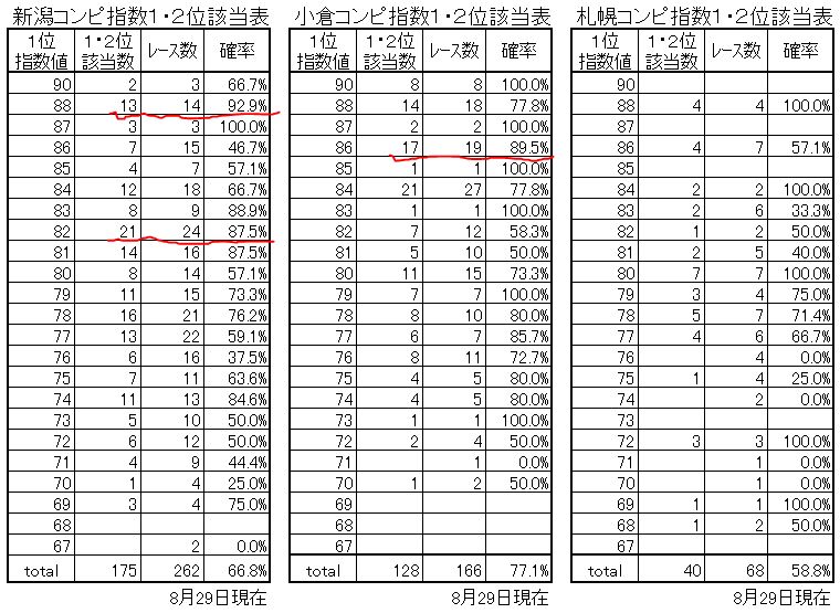 表の中に赤線を入れましたがこれらは確率が狙う上で適しているということです。その赤線の内訳は新潟88は1番目が絡んだのが10レースです。残りは2番目となります。ただし、1番目と2番目の組み合わせは5レースにありました。その時の絡みは1番目にだけプラスしています。従って2番目の3レースは1番目との絡み以外の数字ということになります。82も同様に1番目が16レースで2番目が5レースで1番目と2番目の絡みは5レースでした。小倉の86も同様に1番目が12レースで2番目が5レースで1番目と2番目では2レースありました。